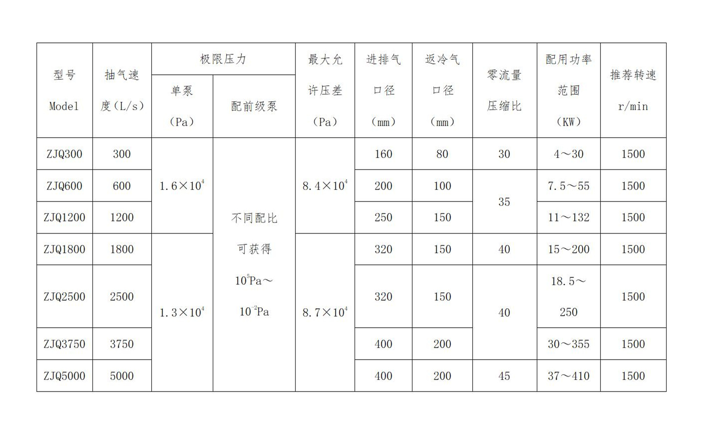 ZJQ氣冷羅茨真空泵工作原理: 氣冷羅茨真空泵通過兩個三葉型轉子,在一對同步齒輪的驅動下交替吸入和排出氣體。氣冷羅茨泵在工作中,被抽氣體是從垂直上方吸入,垂直下方排出。泵的兩端均有冷卻返氣口,向泵內不斷提供冷卻空氣或用冷卻器進行冷卻。 ZJQ氣冷羅茨真空泵工作原理圖: ZJQ氣冷羅茨真空泵技術參數